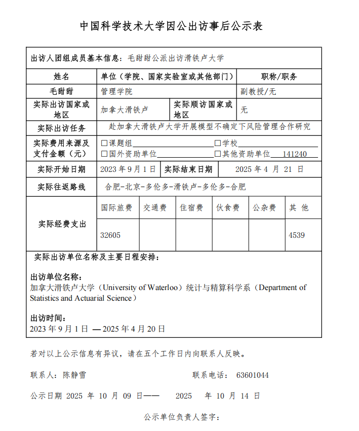 中国科学技术大学因公出访事后公示表(毛甜甜)