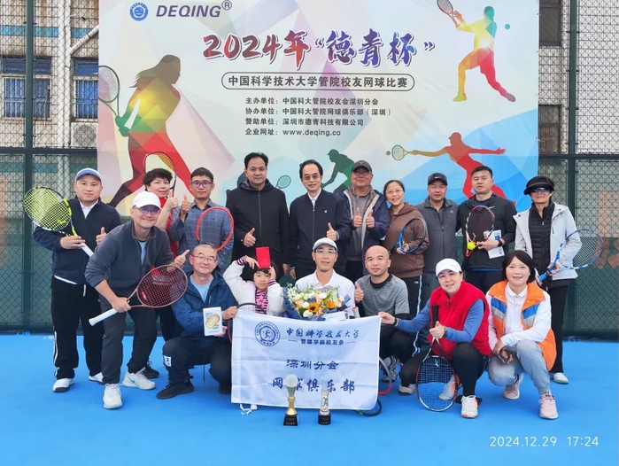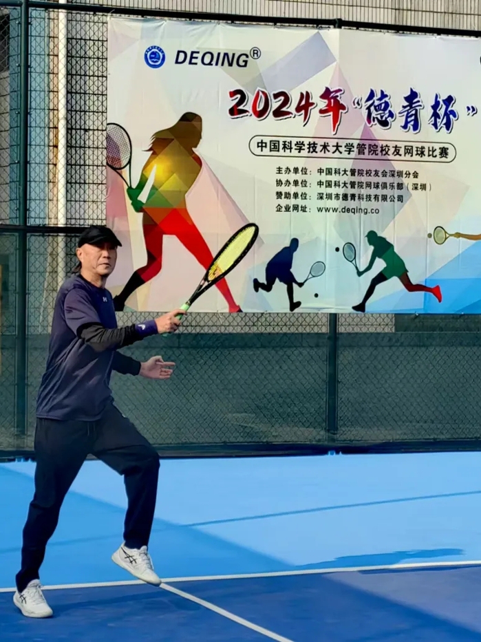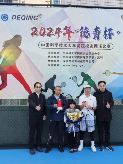 2024年“德青杯”网球赛由2004级MBA曾德群校友的公司——深圳市德青科技有限公司独家赞助。分设男双、混双两项冠亚军。中国科大管院深圳校友会会长谷旭东和校友会秘书长常荣莅临现场观看比赛并为现场球员送上厚礼。