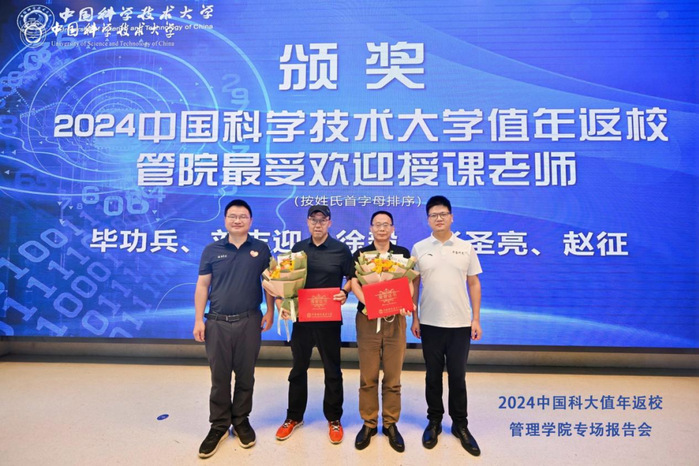 回忆青葱岁月,离不开同窗的倾情陪伴,也离不开老师的辛辛教导。为了表达对老师的感恩之情,除了各个班级的活动,管理学院校友办公室也精心组织了谢师活动。校友们报名此次活动时填写了“最喜欢的管院授课老师”的信息,学院根据这个信息为排名靠前的五位老师颁发“2024中国科学技术大学值年返校管院最受欢迎授课老师”的荣誉证书。他们分别是:张圣亮老师、刘志迎老师、赵征老师、徐毅老师、毕功兵老师。张圣亮老师、刘志迎老师、徐毅老师因有课未能到现场领奖,赵征老师、毕功兵老师代表获奖老师发表感言:交流产生价值、合作创造效益,希望校友们常回家看看。
