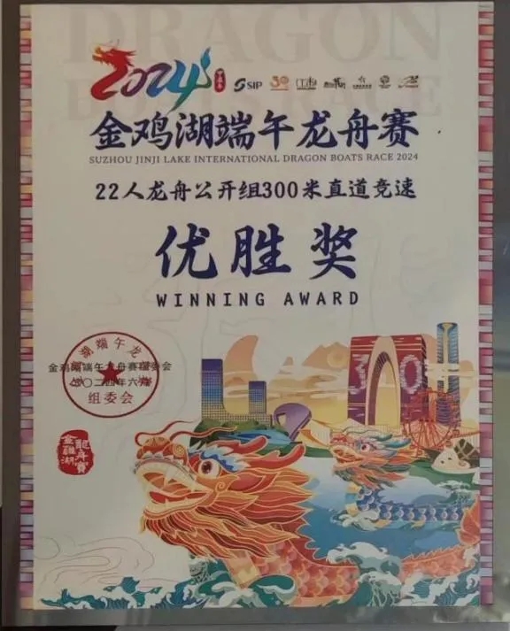 端午节这一天,科大苏高龙舟队迎来了2024金鸡湖端午龙舟赛。22人龙舟公开组300米直道竞速项目,该项目共有14支队伍同场竞技。经过第一轮预赛的激烈比拼,科大苏高龙舟队以第五名的成绩成功晋级决赛。在作为赛事压轴大戏的决赛中,经过一场紧张刺激的角逐,科大苏高龙舟队最终获得了第七名,并因此荣获金鸡湖端午龙舟赛的优胜奖。
