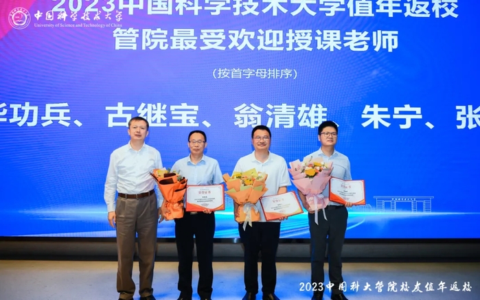 接下来,是一个特别的环节,管院校友办在值年返校前两周发起问卷调查,邀请返校的管院校友们留下最喜欢的老师的名字。最终,古继宝老师、翁清雄老师、毕功兵老师、张圣亮老师、朱宁老师名列前五,荣获“2023值年返校最受管院校友欢迎的授课老师”称号,他们的出色教学受到了广大校友的高度认可。活动当天,张圣亮老师和朱宁老师依旧坚守在教学岗位,未能参加颁奖环节。