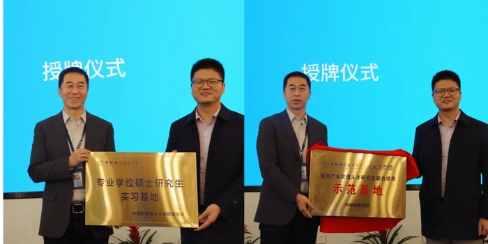 参观结束后,双方在讯飞大学北斗教室举行了校企合作“专业学位硕士研究生实习基地”和“信息产业管理人才研究生联合培养示范基地”的两项授牌仪式,由翁清雄副院长和李剑锋副总裁共同为校企合作基地揭牌。