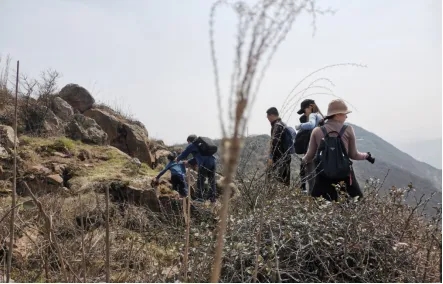 随后,领队选择了一条野径。一路上灌木丛生,鲜少有人走过的痕迹。前几天的雨水加上地面上的荆棘枯草,道路不仅有些难以辨认还显得十分湿滑。面对困难,大家携手相助,迈过绝情谷、穿过一线天,如探险者般,克服重重困难。
