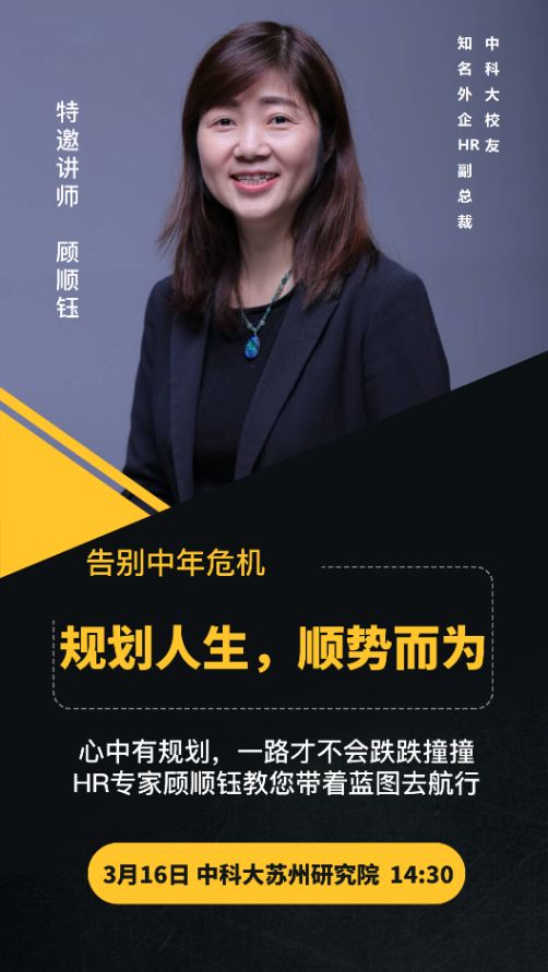 风和日丽的春日,中国科大管院校友会苏州分会(后简称“苏州分会”)邀请到了维苏威高级陶瓷中国有限公司人力资源副总裁顾顺钰与大家展开了一场“规划人生,顺势而为,告别中年危机”主题分享会。