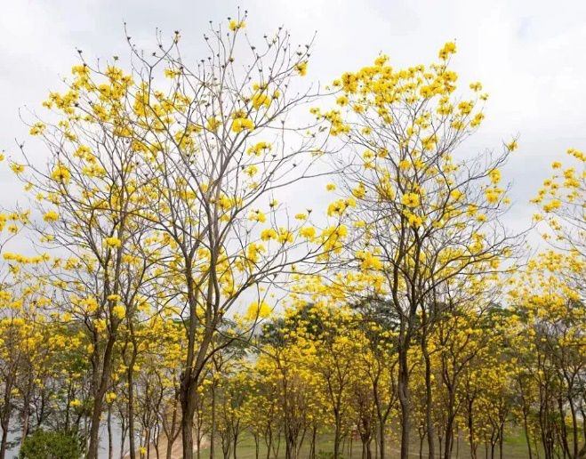 三月的东莞松山湖,春风渐暖,百花盛开,莞城尽带风铃木。200亩黄花风铃木绽放,俯览仿佛一片黄色海洋。黄花风铃木花色金黄,花冠似风铃,微风吹拂,轻盈的花枝在风中摇曳,恰如一串串风铃随风起舞,美不胜收。