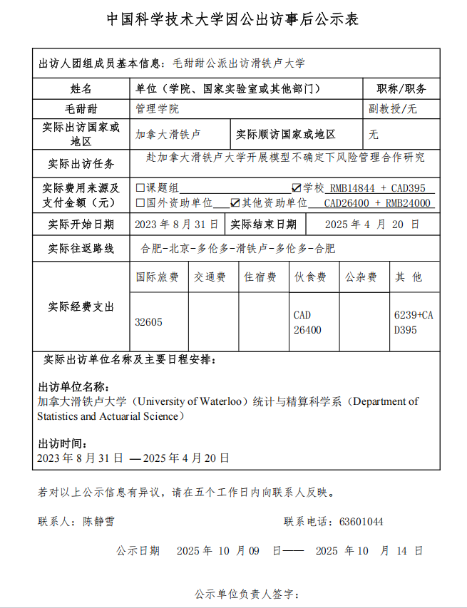 中国科学技术大学因公出访事后公示表(毛甜甜)