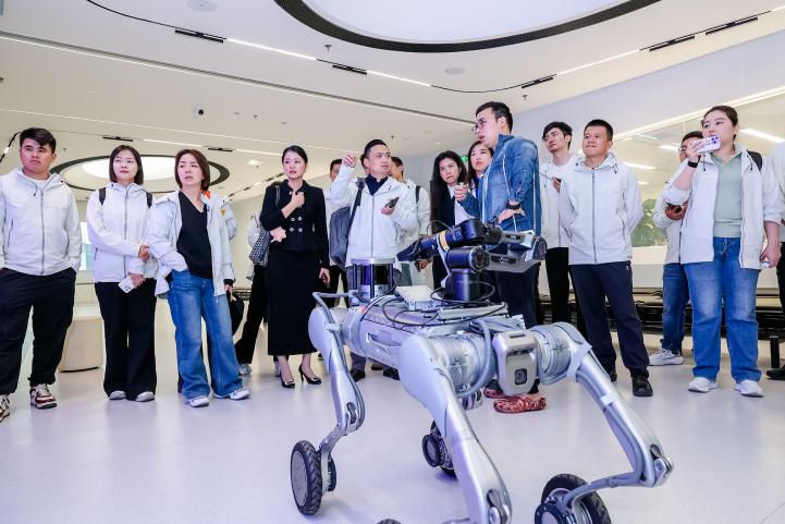 随后,在港科大(广州)知识转移办赵天予老师的带领下,大家先后参观了人工智能与数据科学实验室和港科大(广州)科创成果转移转化基地,深入了解前沿技术攻关进展,以及基地“产学研用”协同创新模式。值得一提的是,在成果转化转移基地,我院师生参访的三度智能&广州磐柔公司正是我校计算机学院几位博士生初创的聚焦产业场景的具身机器人企业。参观了企业最新研发并投入应用的工业场景具身机器人后,还听取了公司主要创始团队成员关于目前发展现状和研究成果的介绍。该团队早在2016年参与研发的机器人“佳佳”——作为中国首台特有体验交互机器人,其技术根基源自屡获殊荣的中科大“可佳”机器人家族,依托曾斩获第23届国际人工智能联合大会(IJCAI)“最佳自主机器人奖”“通用机器人技能奖”、RoboCup国际服务机器人标准测试世界冠军,并连续三年蝉联国家服务机器人标准测试总分第一的核心技术积淀——凭借亮眼的技术实力与丰富的应用场景,给学员们留下了深刻印象。大家都深刻体会到,高校需打破传统科研边界,以市场需求为导向推动产学研深度融合。