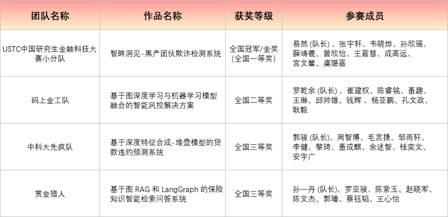 未来,我院将持续以服务金融强国建设为己任,以创新竞赛为重要驱动平台,深化 “产教融合、科教融汇” 机制,全面提升研究生在金融科技前沿的创新与实践能力,为新质生产力培育、中国金融高质量发展注入科大动能!